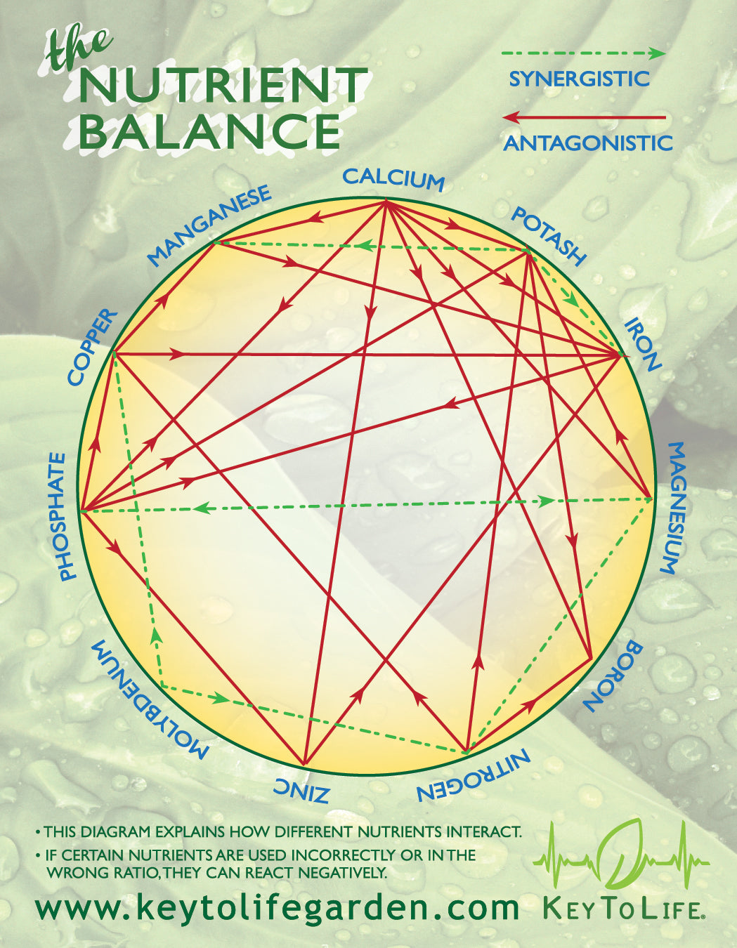 - Antagonistic relationships (shown in red) indicate competition — excess of one nutrient can inhibit another.